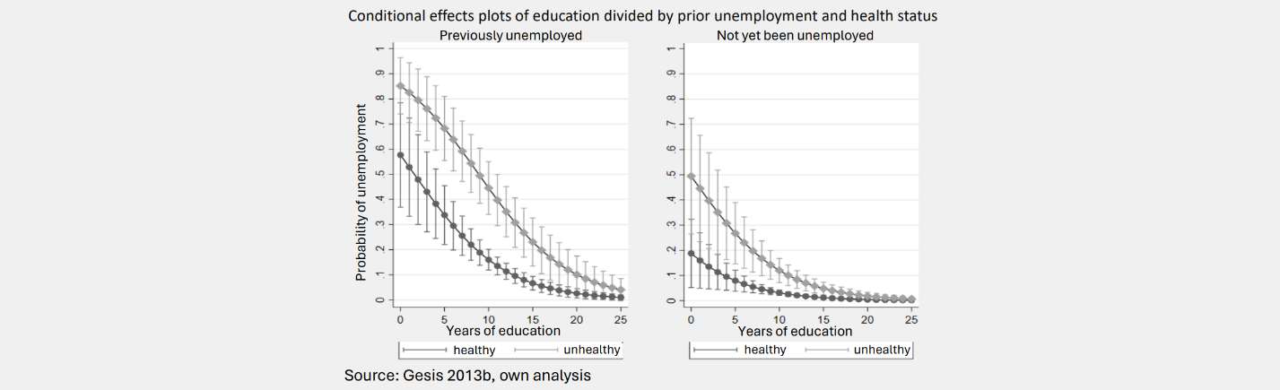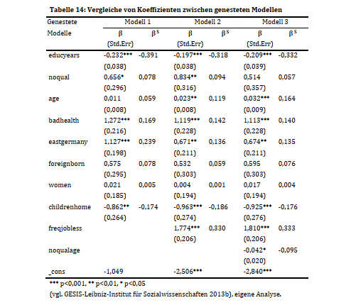 Abstract: Over the last few decades the effect sizes Logits and Odds Ratios from logistic regression models were criticized for being difficult to use and hard to understand. Additionally they seem to be biased by the unobserved heterogeneity and therefore can't be interpreted as stable predictors for binary dependent variables or compared between groups. Instead it was recommended to use linear predictors like the AME or a different regression model like the LPM. But those also showed distortions. As a first step towards providing clarity this master thesis summarized the entire statistical theory and the current research regarding the logistic regression. The second step consisted of applying the correct usage on the empirical example of the determinants of unemployment. The models were theoretically based on the human capital theories and used their data from the ALLBUS survey of 2012. Interpretations of their outcome as well as the comparisions between effects were done in context of the model specification and focused on the model fit measurements. Additionally the AMEs and the LPM were used for comparing the effect sizes between different groups and the results between different models. Odds Ratios and AMEs corresponded to each other. The LPM however showed a worse model fit and partly different results.